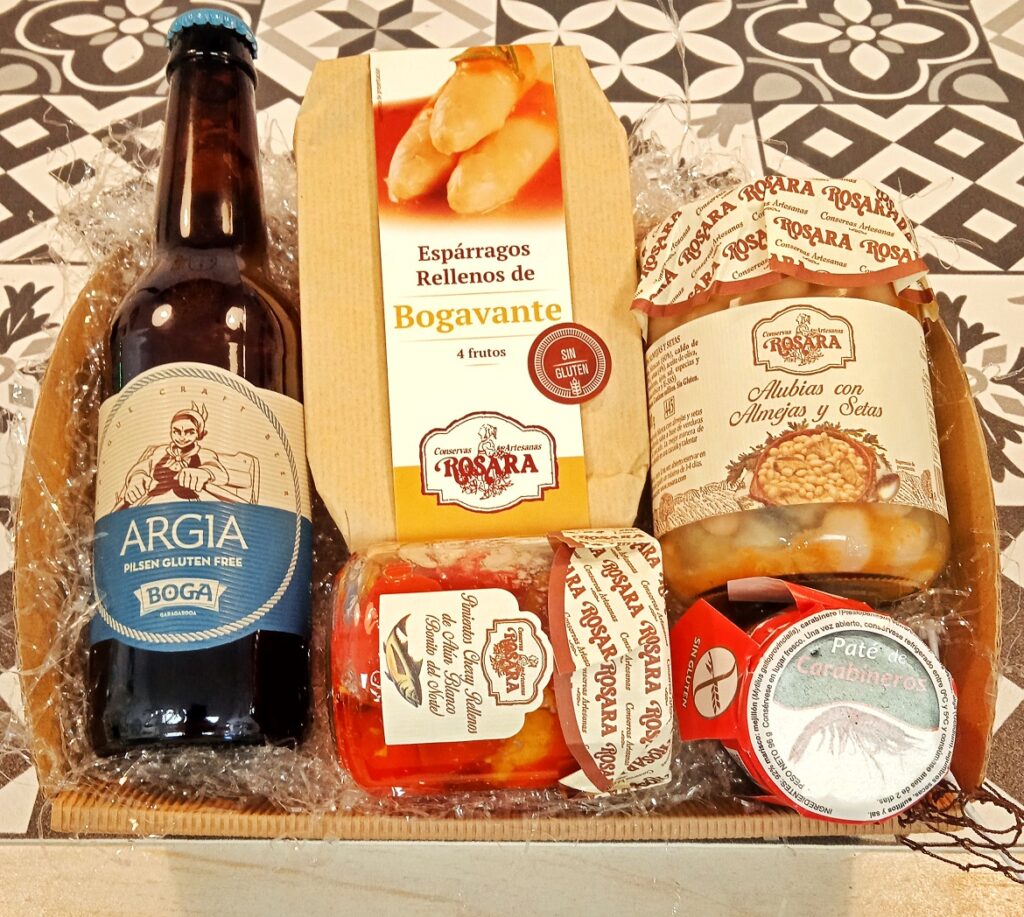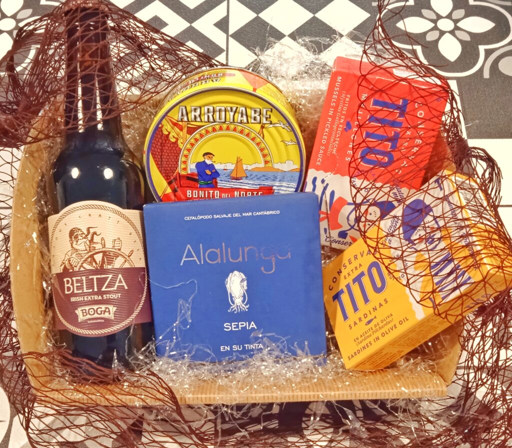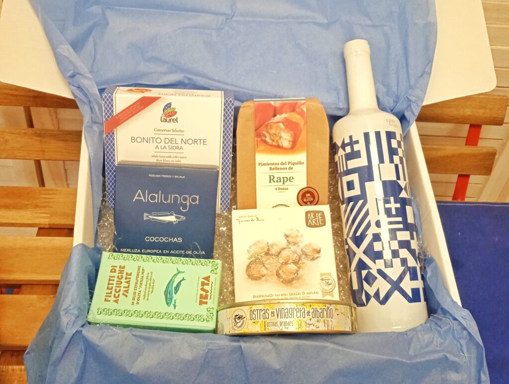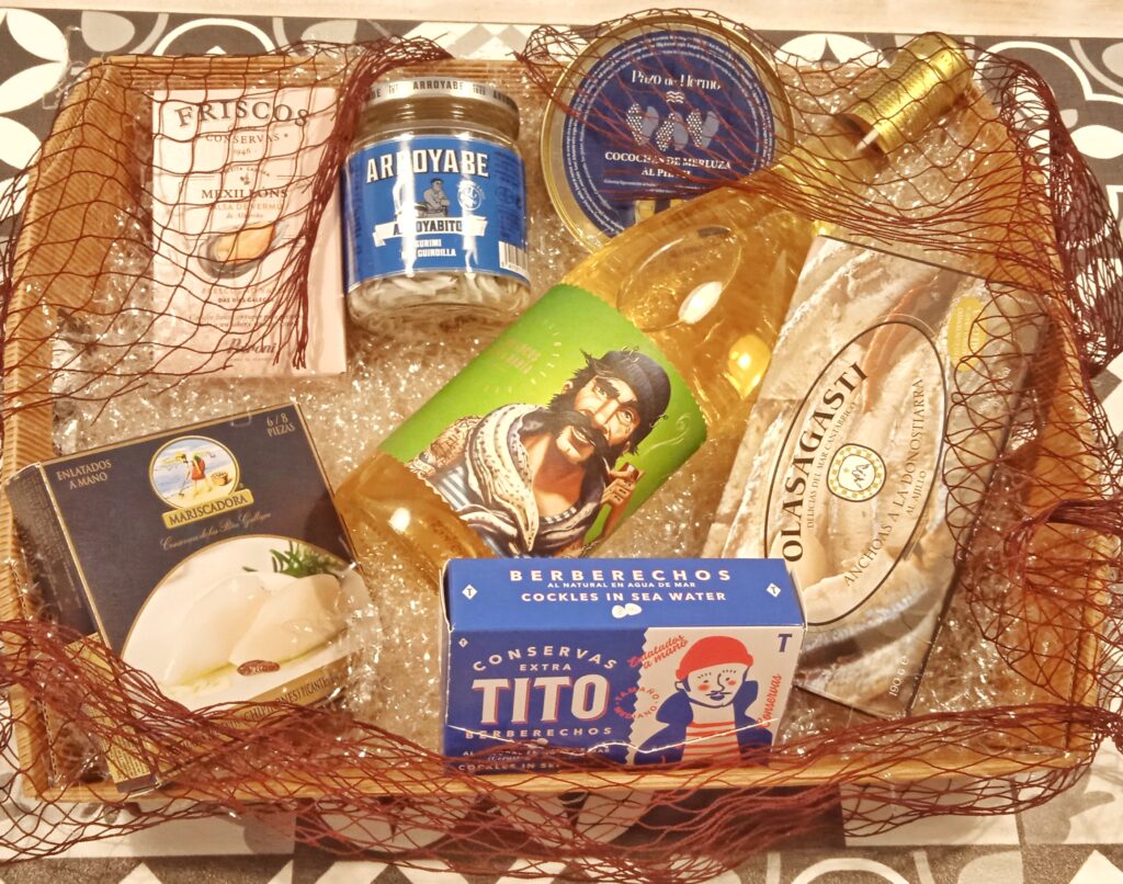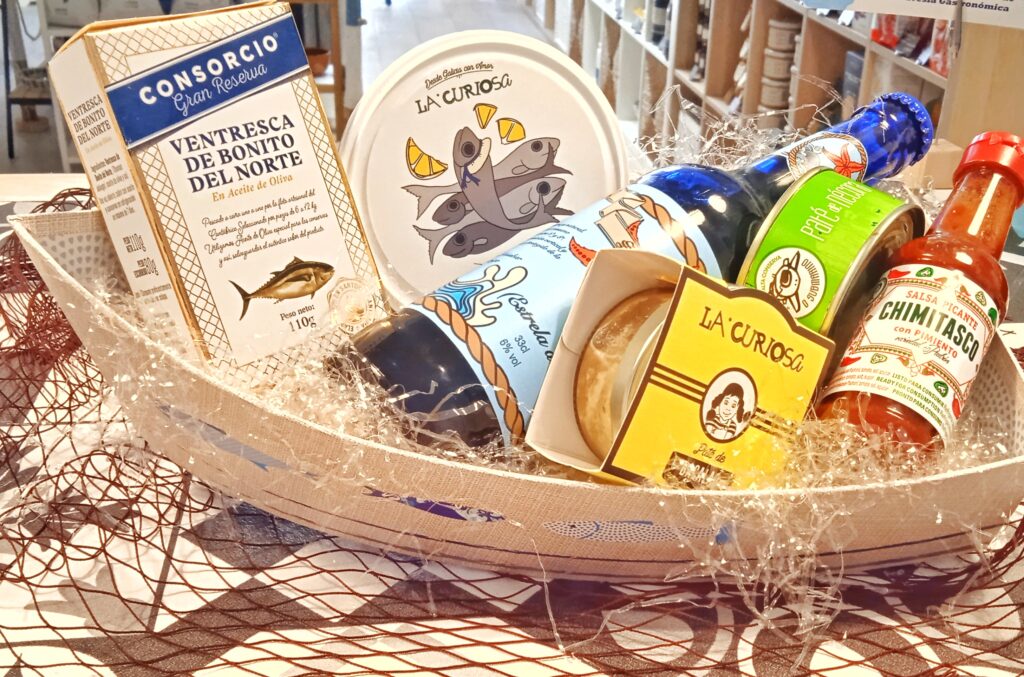 –Esta cesta puede ir envuelta en red auténtica de pescador de la Lonja de Vigo ( Galicia) o en celofán