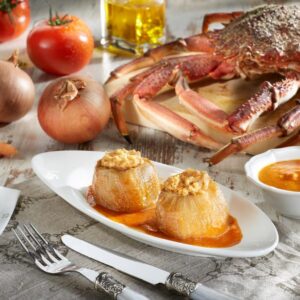 Espárragos de Navarra rellenos de bogavante en salsa de marisco