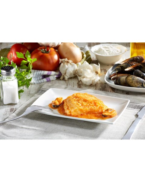 Ingredientes: Filetes de bacalao, cebolla, tomate, mejillones, harina de trigo, sidra, aceite de oliva, ajo, perejil, sal y especias.