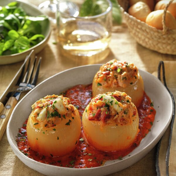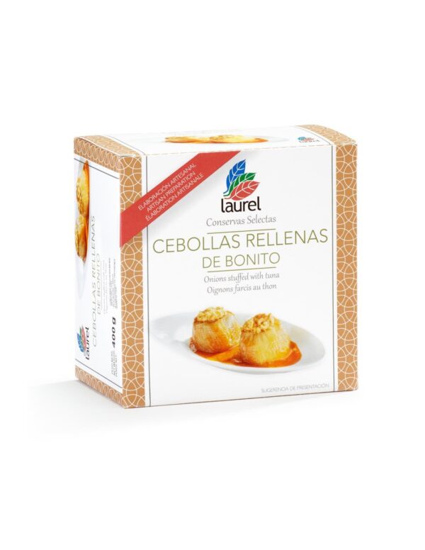 Cebollas minuciosamente seleccionadas rellenas de un guiso de bonito del norte acompañadas de una salsa artesana para resaltar la mezcla de sabores.
