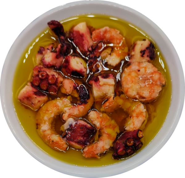 Pulpo, Gambón, aceite de oliva virgen extra, ajo, sal y guindilla